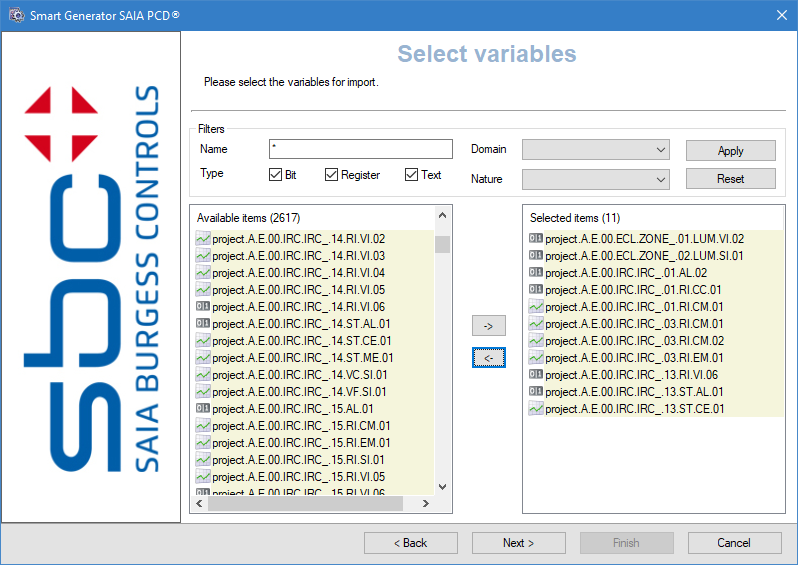 The Smart Generator SAIA PCD allows you to import a Saia-Burgess symbol file to generate the following PcVue configuration elements: