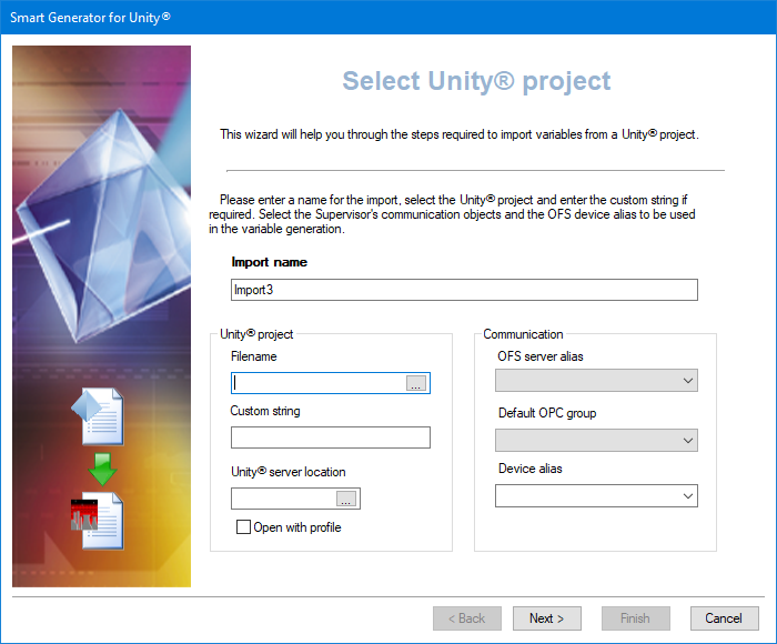 Select the Unity project filename. The file can be located on the local PC or any network location visible to the smart generator.