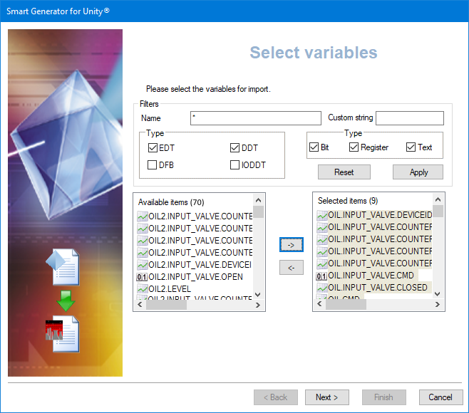 (Optional) Enter a Custom string. This property pre-filters the import by matching the supplied string against the contents of the variable's comment field in the Unity project database. Only variables with comments containing the supplied string pass the pre-filter. For example, if you enter {hmi} in the Custom string field, the smart generator will only makes available items whose comment field contains {hmi}. This custom string does not support wildcards.