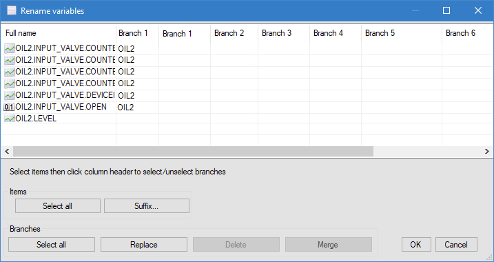 - To replace branch segments, select the variables, then select the branch segments to be replaced by clicking on the column header and click Replace to open the Replace dialog. Enter the strings to search and replace, then click OK.