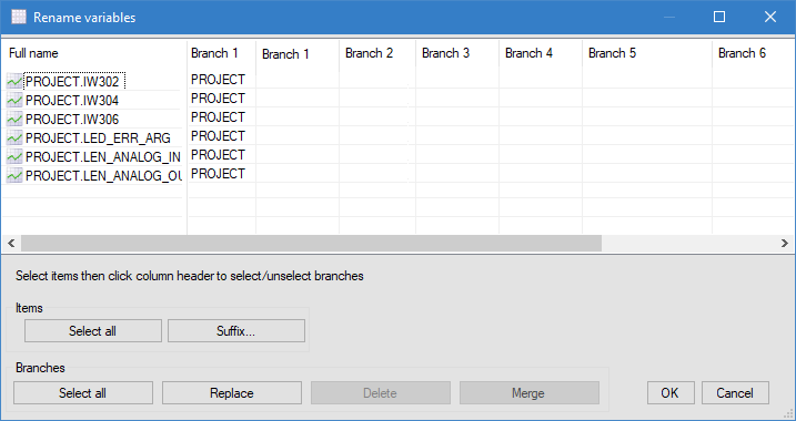 The Rename variables dialog is designed to make it easy to give a final polish to variable names and fix invalid ones, and also to bulk modify variable properties, to set the Command level or Alarm property for example.