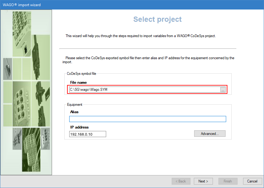 Click on the ellipsis button in File name field, then select the .sym file that contains the WAGO CoDeSys project file to import.