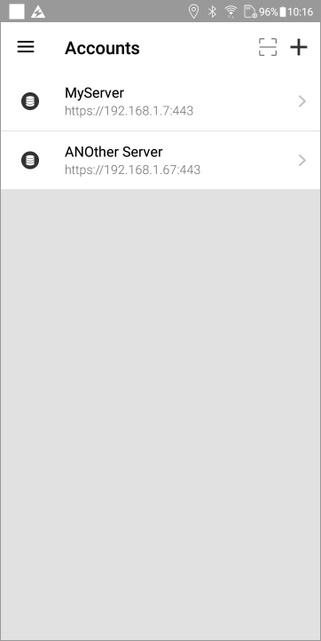 The Accounts view is used to manage the accounts used to connect the app to the Web server. The app can be configured for, and simultaneously connect to, one or more server. This view is automatically displayed if you start the app and no account is configured.
