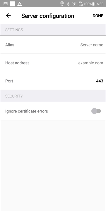 If you have been given a QR code, tap the scan button near the '+' button to scan the QR code. The Alias, host address and port are automatically filled, step 1 to 5 are skipped and you are directed to the Login view.