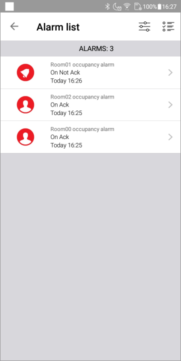 Menu actions are displayed by tapping the icon and are applied to all selected alarms: