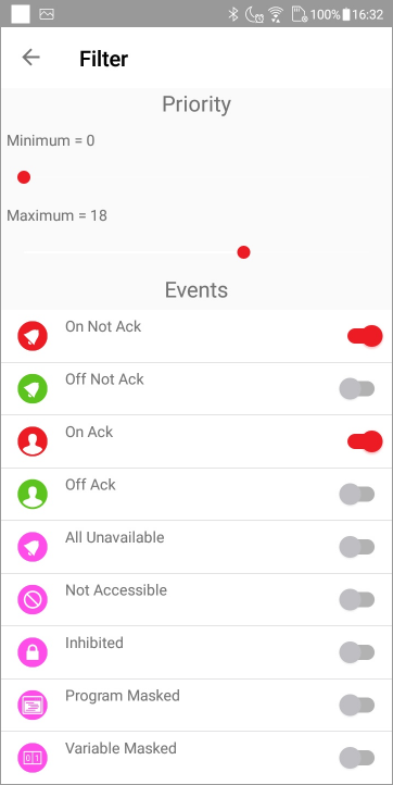 The Filter view is displayed by tapping the icon. It displays, and allows the user to customize the alarm list filter.