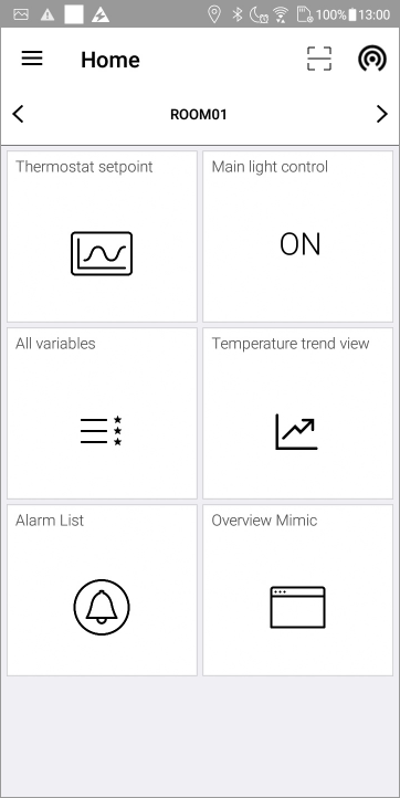 - Home - The primary view comprising of one or more context sensitive tiles, one for each action available for the detected location. See the Home view topic.