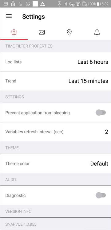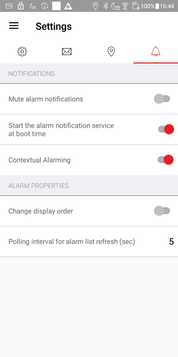 - Start the alarm notification service at boot time (Android app only) - Start the alarm notification service at device boot time. This means that, once logged in, alarm notifications will be displayed, even after a device restart, without the need to restart the app. The default is On.