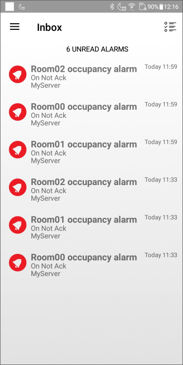 The Inbox view displays a list of the most recent 50 alarm notifications. The notifications are stored locally on the device and are displayed even if the device is not connected to the Web Server. Show picture