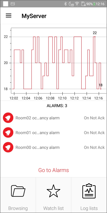 - Alarms. A summary of the most recent alarms. Tapping a single alarm takes you to the Variable details view for that alarm. Tapping Go To Alarms takes you to the Alarms list view.