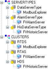The cluster named HDS contains one OPC Historic Data Access server, FVHistoricServer, and hence provides historic data to the Trend and Log Viewers.