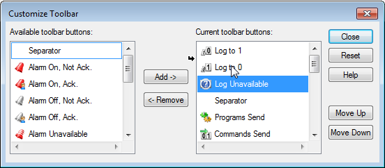 You can allow the User to change both the position and contents of the Alarm Viewer, Log Viewer, Trend Viewer or Grid toolbar at run-time.