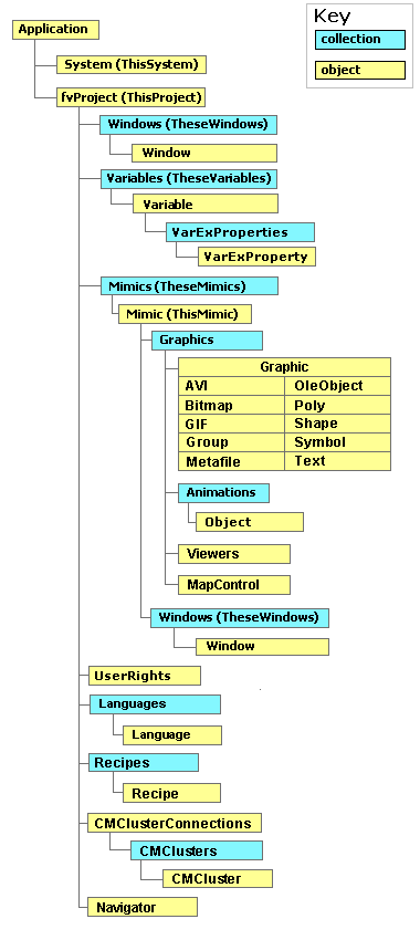 To manipulate HMI objects, you must know the relationships among them. The highest level object is Application. All other objects are subordinate to it, so you can use the Application object's properties and methods to access the subordinate objects.
