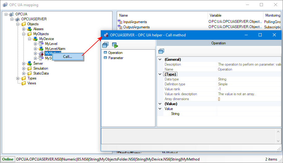 The OPC UA helper allows you to send call method requests to a server with specified input arguments. Calling a method from the OPC UA helper is designed to be used for testing while configuring the project. You can use the SCADA Basic instruction OPCUA mode METHOD to call OPC UA methods at runtime.