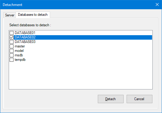 Databases to Detach shows a list of databases that are currently attached