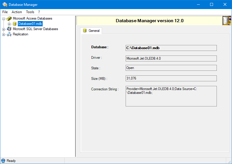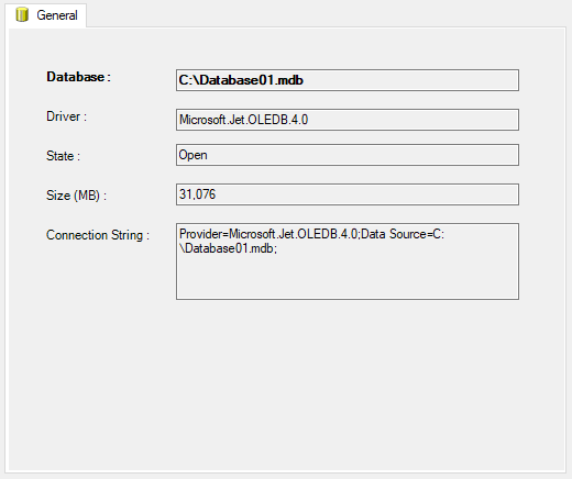 The properties are displayed in the right-hand pane. This is the default function when you select a database in the tree structure. For both types of database, Access or SQL Server, the right-hand pane shows: