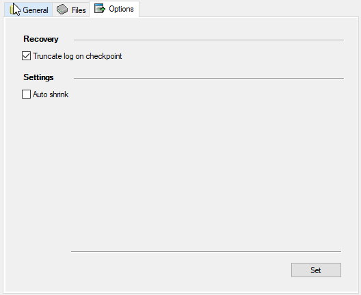 The only properties that can be set from the Database Manager are those on the Options tab.