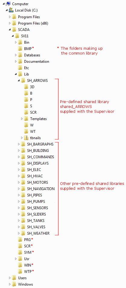 If you chose the Typical setup when installing PcVue, several predefined libraries are installed with names such as shared_ARROWS, shared_MOTORS etc.