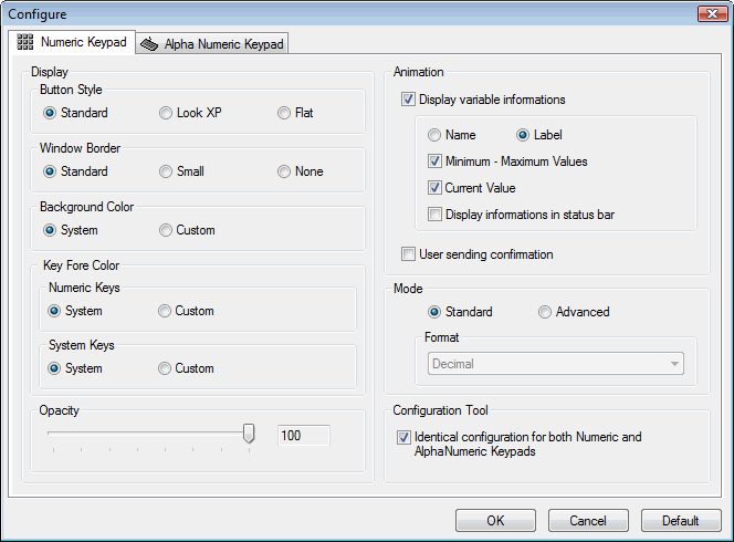 The dialog contains two tabs, one for the configuration of the numeric keypad, the other for the alphanumeric keypad. Many of the properties are common to both keypads. It is recommended that you select the option, Identical configuration for both numeric and alphanumeric keypads, which will ensure the two keypads have a similar appearance.