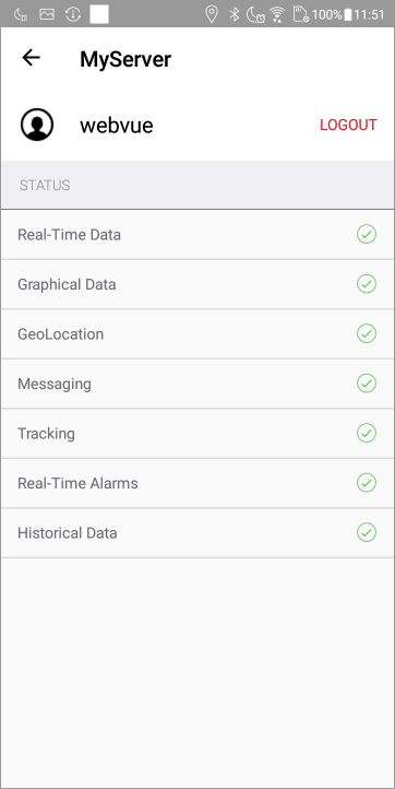 To log in enter the Username and Password. The login process takes a few seconds whilst the app connects to the Web server. After logging in is successfully completed the Status view is displayed showing the status of the various services used.
