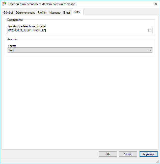 - Vous pouvez saisir un nom ou un profil utilisateur parmi les comptes utilisateurs du logiciel PcVue. Si vous saisissez un nom d'utilisateur, le message sera envoyé au numéro de téléphone mobile saisi dans la configuration de l'utilisateur. Si vous saisissez un profil utilisateur, le message sera envoyé à tous les utilisateurs attachés à ce profil.