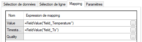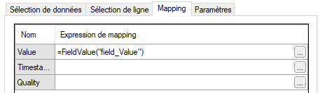 Dans l'onglet Mapping, seule la valeur est mappée. Comme le mapping de l'horodate n'est pas défini, l'horodate est fournie par PcVue.