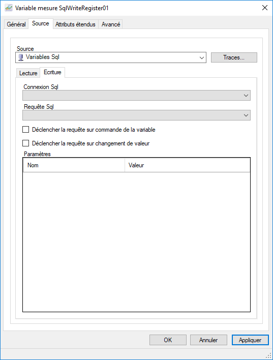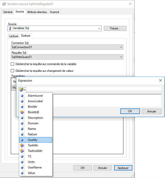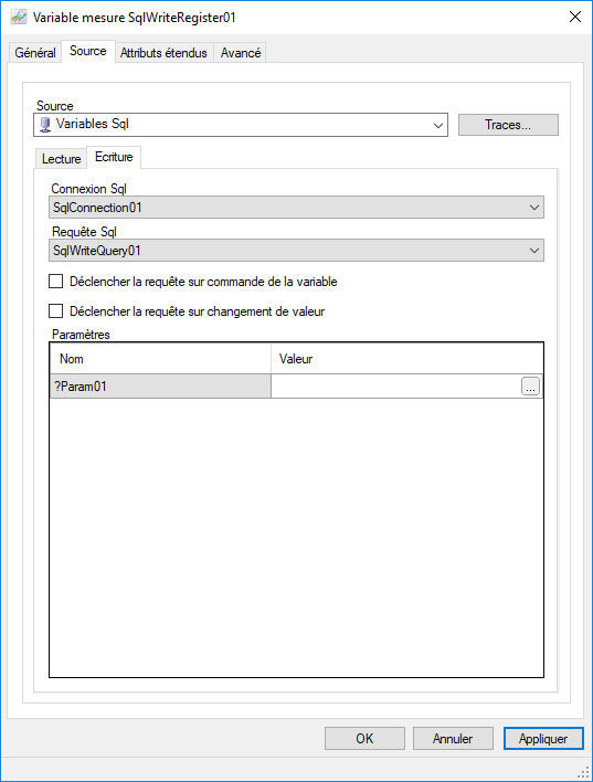 Une variable, ayant la propriété Commande, peut être liée au résultat d'une requête Sql d'écriture en choisissant la source Variables Sql. Voir la rubrique Généralités sur les Connexions de Données. Lorsqu'une variable est liée de cette façon, ses propriétés, y compris sa valeur temps réel, peuvent être enregistrées dans une source de données tierce telle que SQL Server de Microsoft. Les requêtes d'écriture peuvent être configurées pour qu'elles soient exécutées périodiquement, lors d'un événement et/ou lorsque la variable change (soit en raison d'une commande ou d'une modification de la valeur).