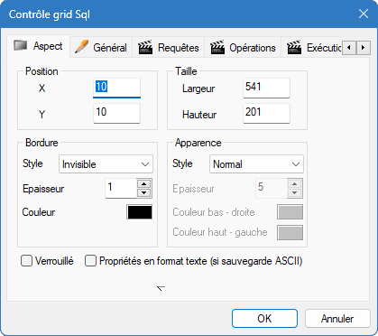 Insertion d'un contrôle Grid Sql et configuration des propriétés Aspect et General