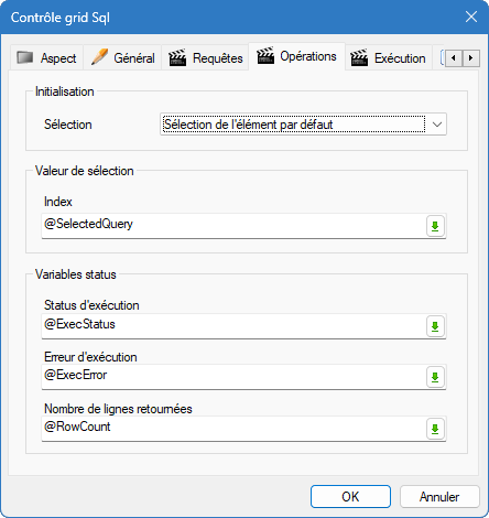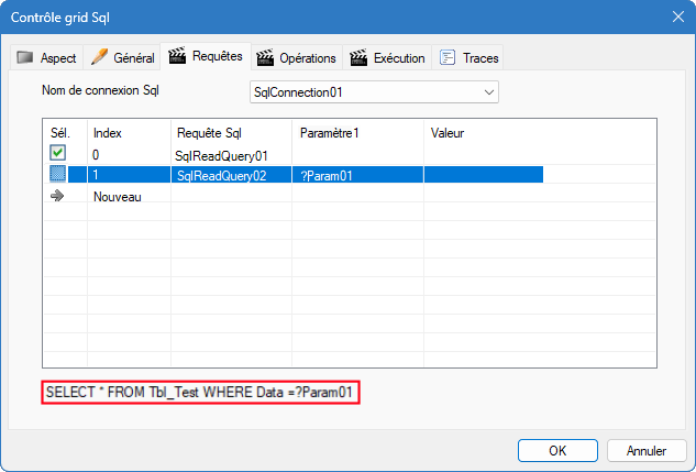 Plusieurs requêtes Sql peuvent être configurées dans la grid, mais seule celle qui est marquée comme étant sélectionnée est utilisée pour remplir le contrôle au moment de l'exécution. Les variables associées ou le SCADA Basic vous permettent de passer d'une requête Sql à une autre au moment de l'exécution.