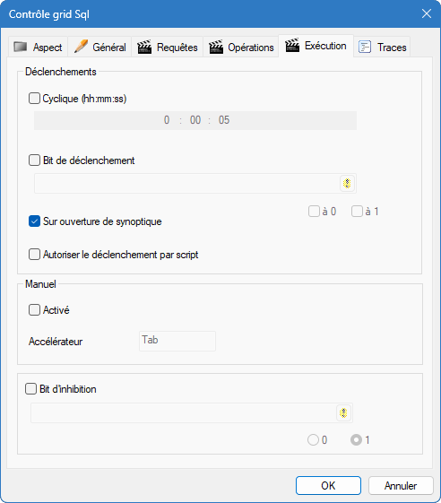 Sur l'ouverture d'un synoptique - Si cette option est sélectionnée, elle active l'exécution de la requête sélectionnée lorsque le synoptique contenant la grid est ouvert.