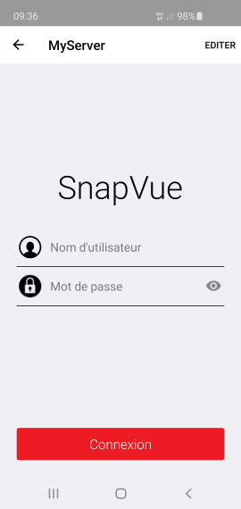 - L'appui sur l'icône EDITER ouvre la vue Configuration du serveur pour le compte sélectionné.