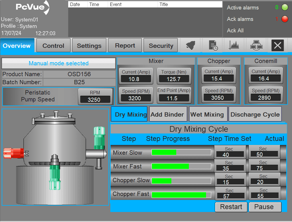 USV Limited, a prominent pharmaceutical company based in Daman in India, 4 hours away from Mumbai, is recognized for its high-quality pharmaceutical products, initiated a project to improve the monitoring and control of two 1200L Rapid Mixer Granulators (RMG04 and RMG06). At first, USV used another SCADA to monitor their granulation processes. However, frequent software crashes and issues with date and time stamps led to significant operational inefficiencies, prompting the company to seek a more reliable solution. In 2021, after testing PcVue SCADA for a couple of months, USV was impressed with its reliability and decided to proceed with the migration.
