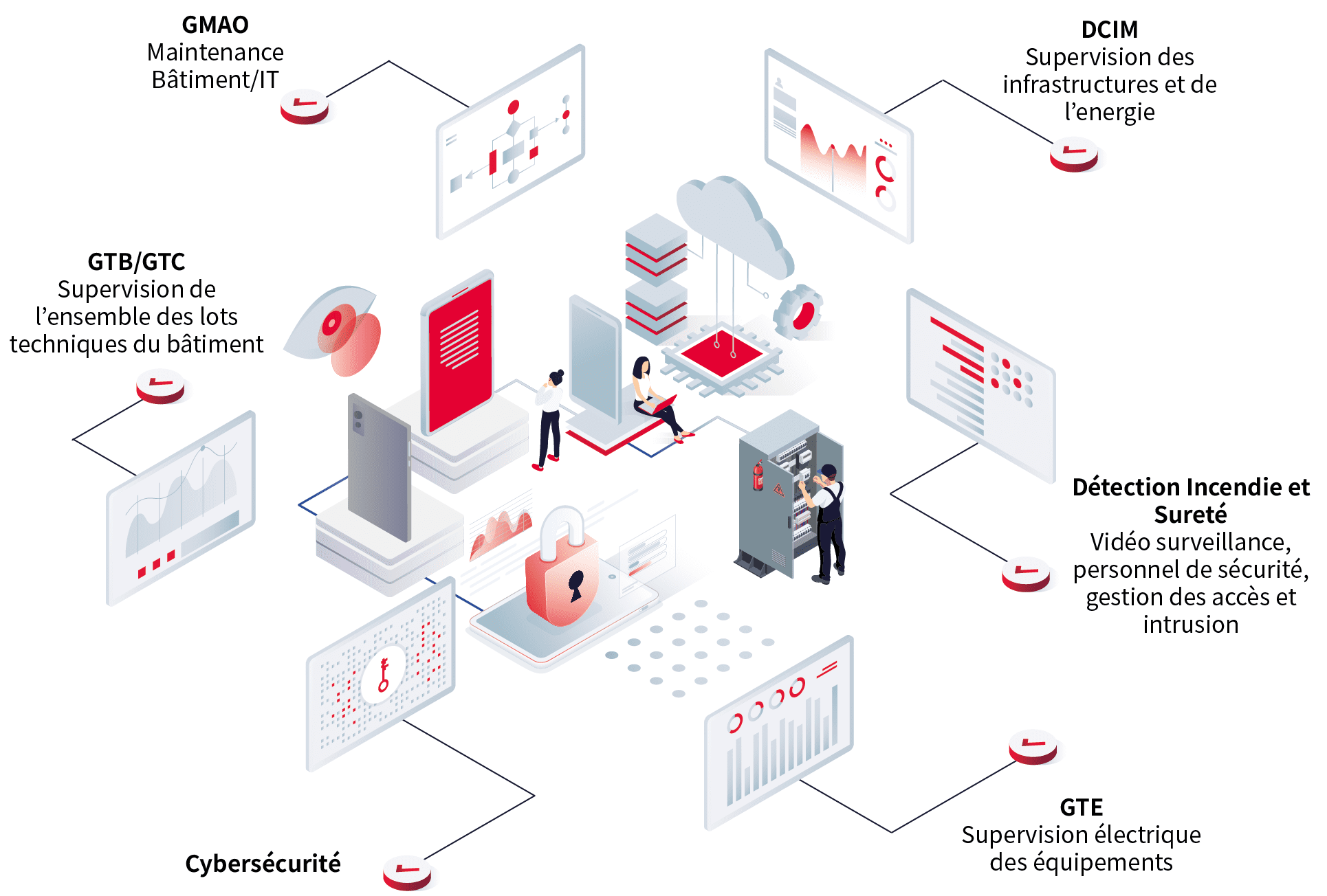- DCIM : Intégration des infrastructures IT (réseaux, refroidissement des baies, serveurs, indicateurs de performance tels que PUE, température, charge SNMP, etc.).