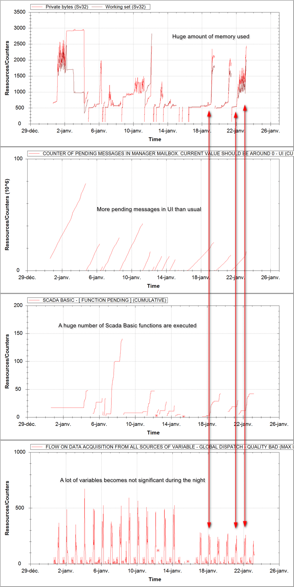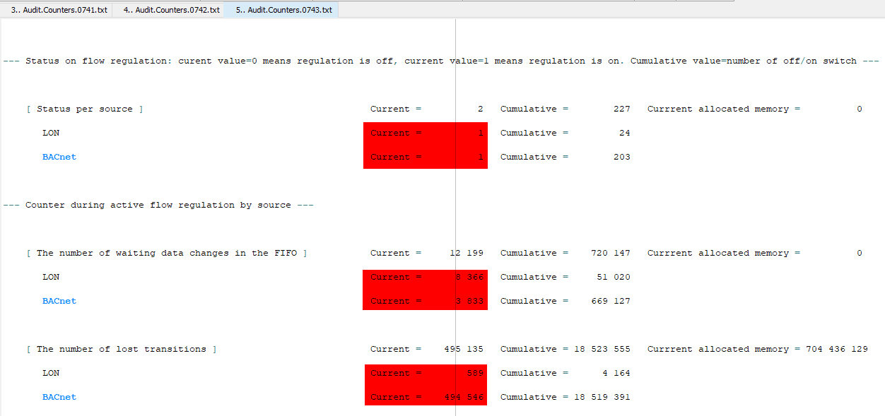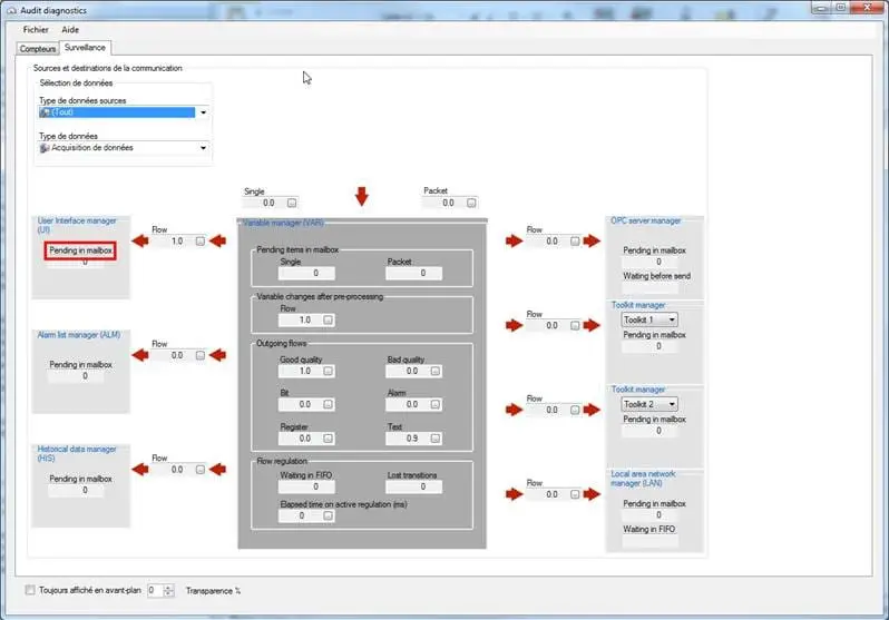 If you have rights to acess to the Audits and Diagnostics dialog box, available since PcVue version 11, then you can display the monitoring tab in order to see which manager is saturated (“Pending in mailbox” counter value must be very high): Thanks to the Application Explorer, you can also add some system variables in order to monitor that information in the project: In the same Audit file, if we look forward we can see that flow regulation is activated for LON and BACnet protocols. We also observe that there are many pending messages and many lost transitions: