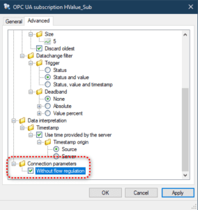 3.3. Disable Flow Regulation : In the advanced settings, it’s important to check the “Without flow regulation” box. Flow regulation can cause data loss by restricting the number of records to process. Disabling it ensures every data is transmitted without missing any updates, which is critical for accurately tracking changes in HValues.