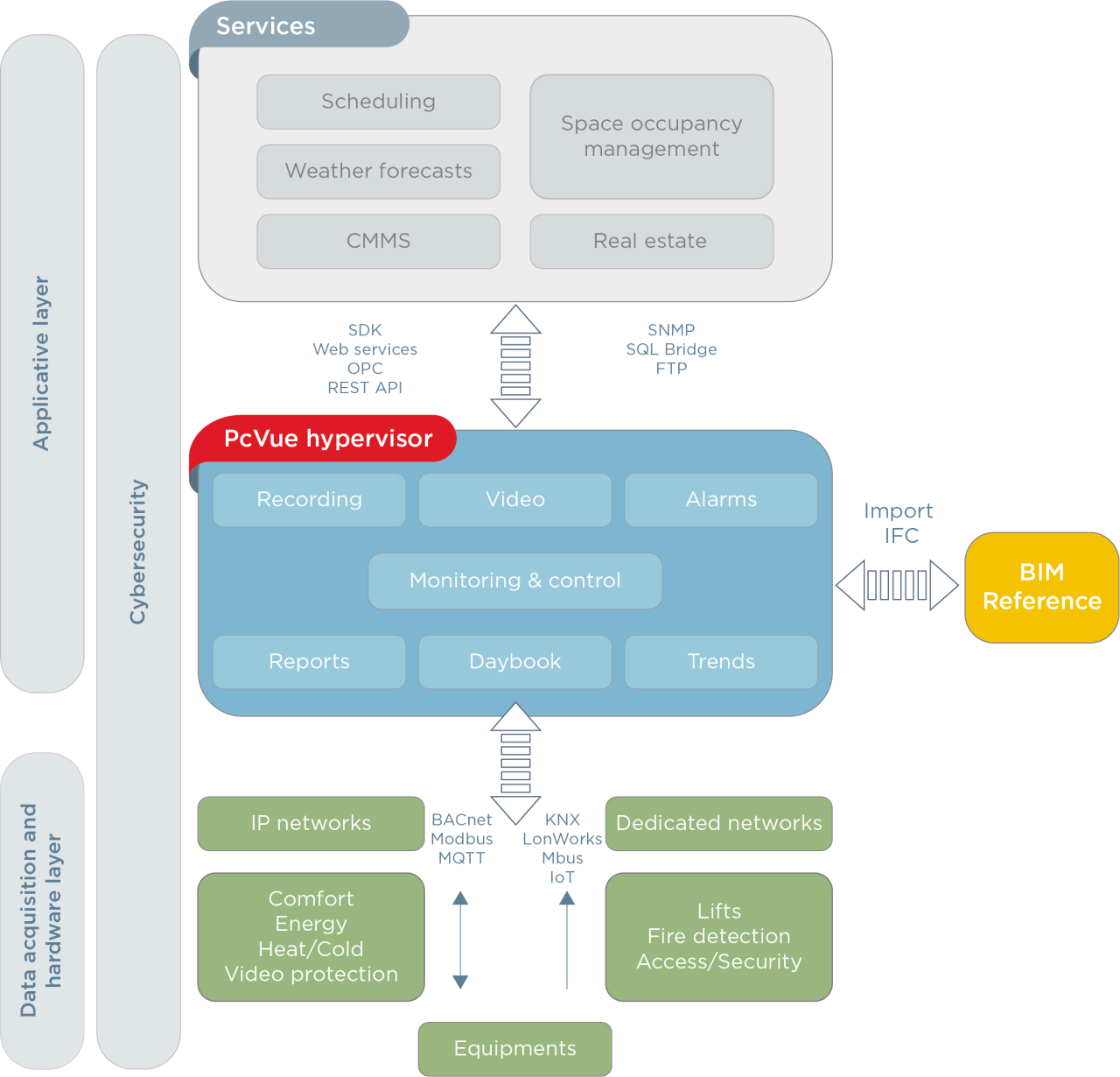 PcVue is part of an architecture that complies with the SBA (Smart Building Alliance) R2S reference framework with an application layer and communication and hardware layers.
