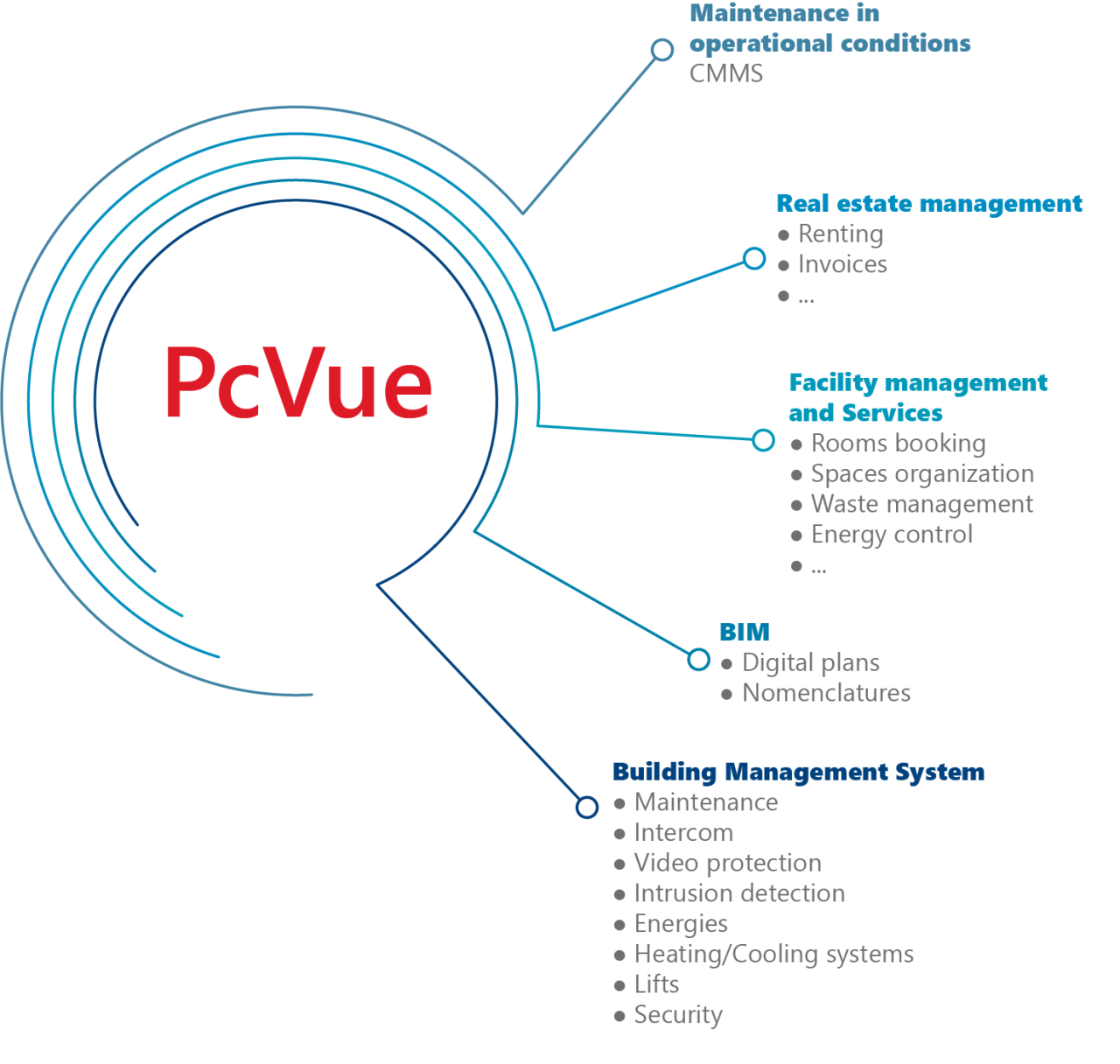 In the application layer level, PcVue gathers BIM operation information and allows the visualization of these in real time and animated on 3D representations. It also interfaces with all building services via the numerous connectors and exchange standards natively available in PcVue.