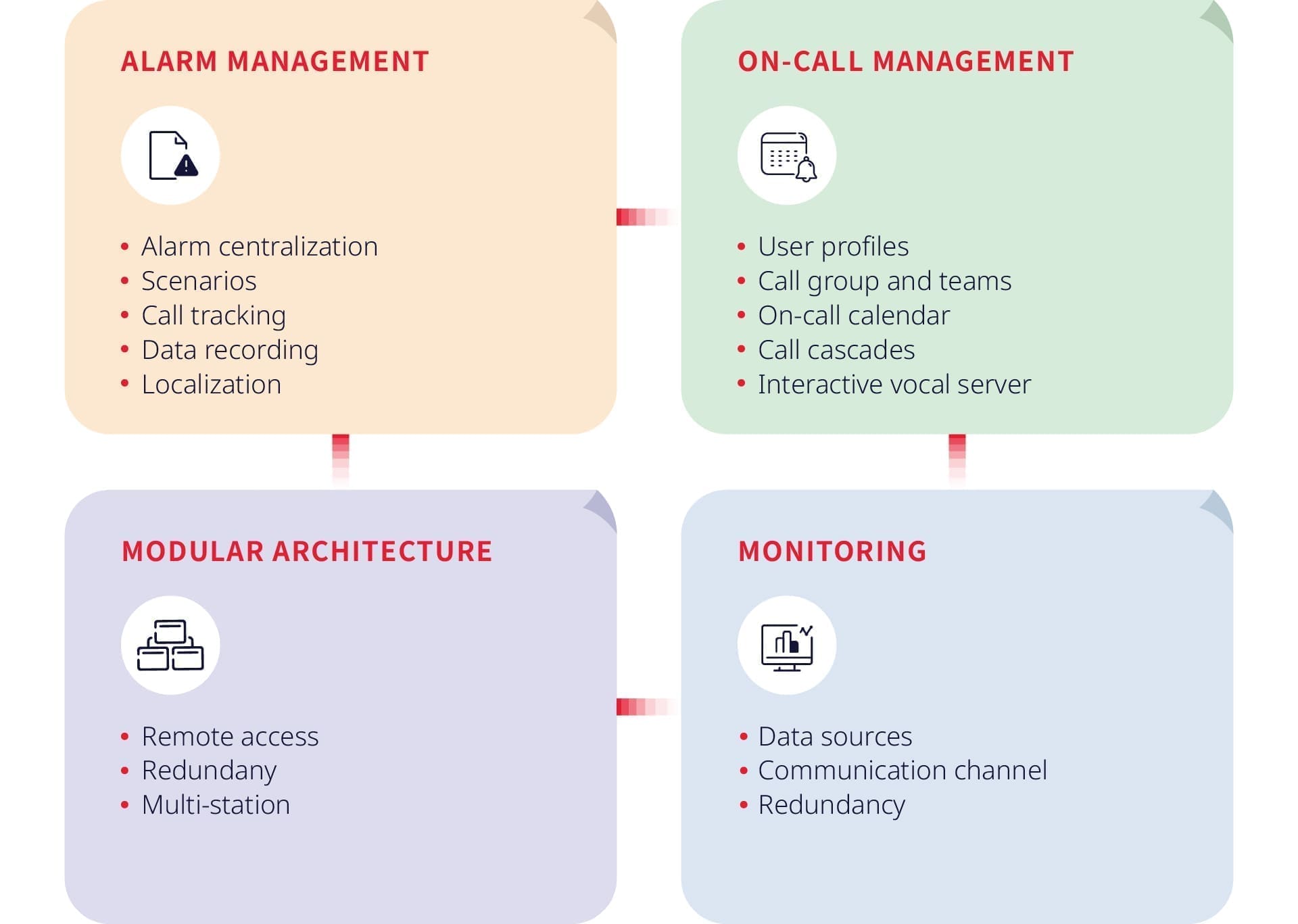 Alert™ is able to treat alarms and to execute commands from different sources (Automation software, PLC’s, files, databases…), offering operation control, reduced downtime and maintenance efficiency at any level. Alert™ displays multiple capabilities, such as alarm management, operator or on-duty group calling, and the execution of specific actions lists.